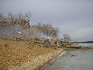 deteriorating to the point of being unsafe. Tim stands next to the draft hole we cut in the back of the hollow tree to aid in combustion. |